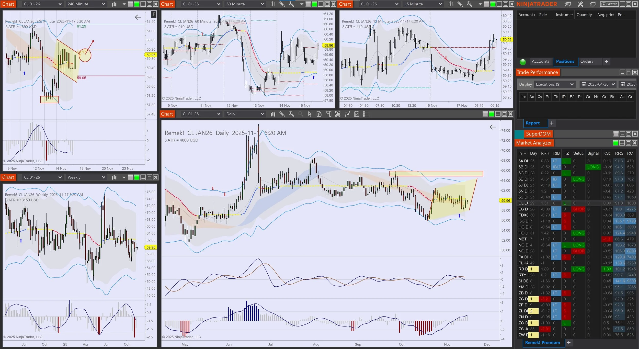 Note the upper left corner of our charts: that’s where we display messages to help you internalize our process and monitor events. Note that there is no Setup message on the 240m chart at the moment, and the reason is simple: the trade has triggered, and the setup has become a trigger (shown as a blue arrow).
