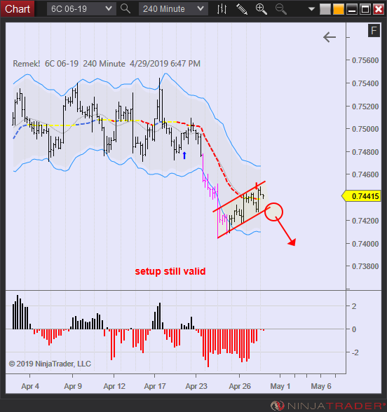 With several shorts on currencies either setting up or underway, with ZB (long) and GC (short) setting up, it is important to be patient and wait for the trigger. There are two rules: IF trigger, THEN enter and IF setup fades THEN standby. This latter means that there is a certain number of candles we’re willing to wait for the trigger, after which we stop being interested. (i.e. the setup fades). E.g. GC is setting up, but it’s taking a long time (see 240min). If it doesn’t get triggered soon, I’ll stop being interested.