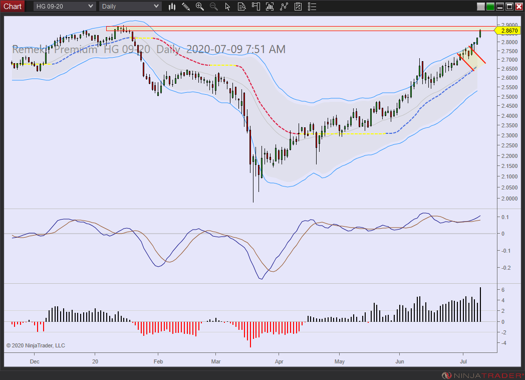 Commodities: GC/SI re-traded area, likely bullish move next HG: likely a “grind along the Keltner”, a pattern characterized by a lack of pullbacks (see jpg below)