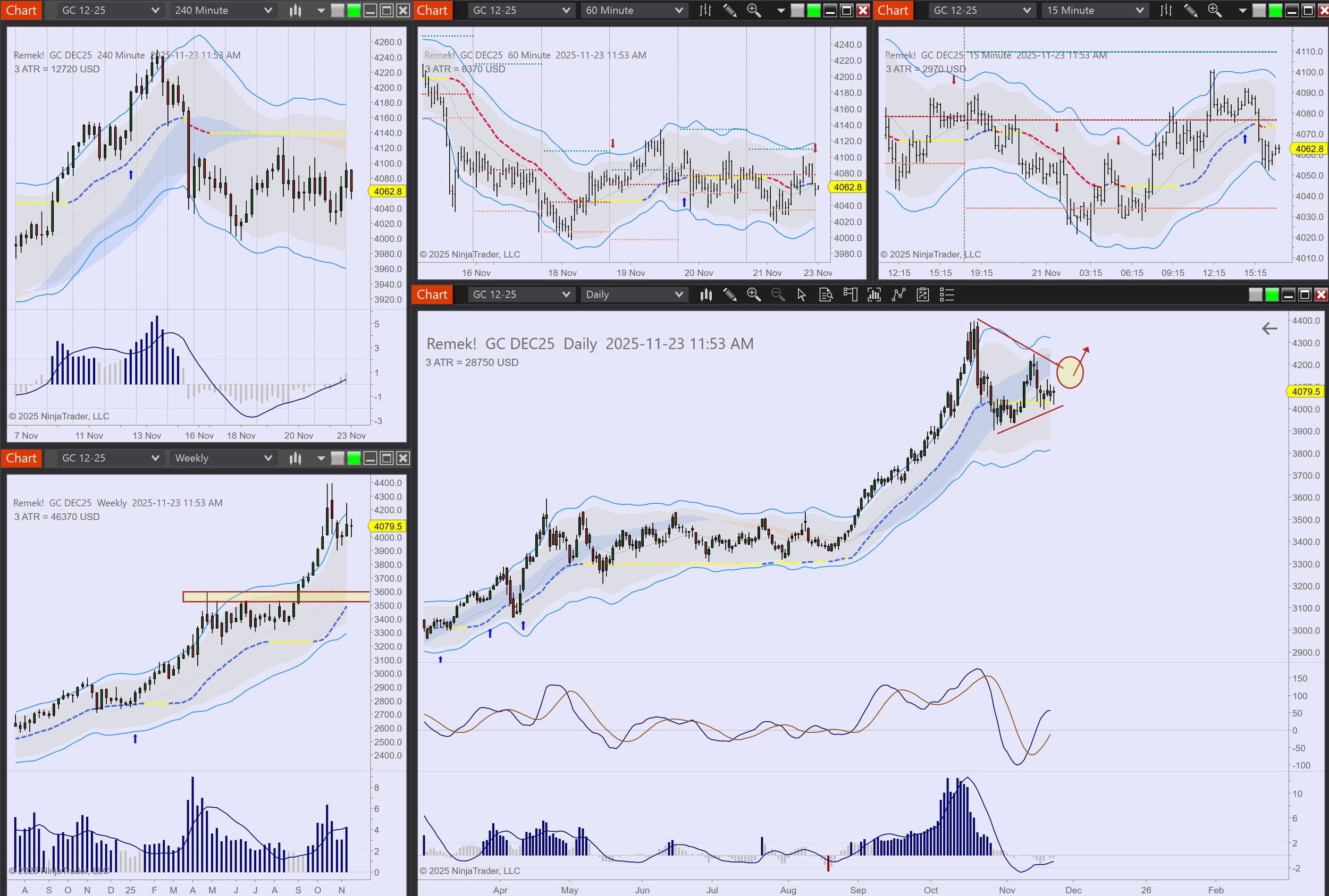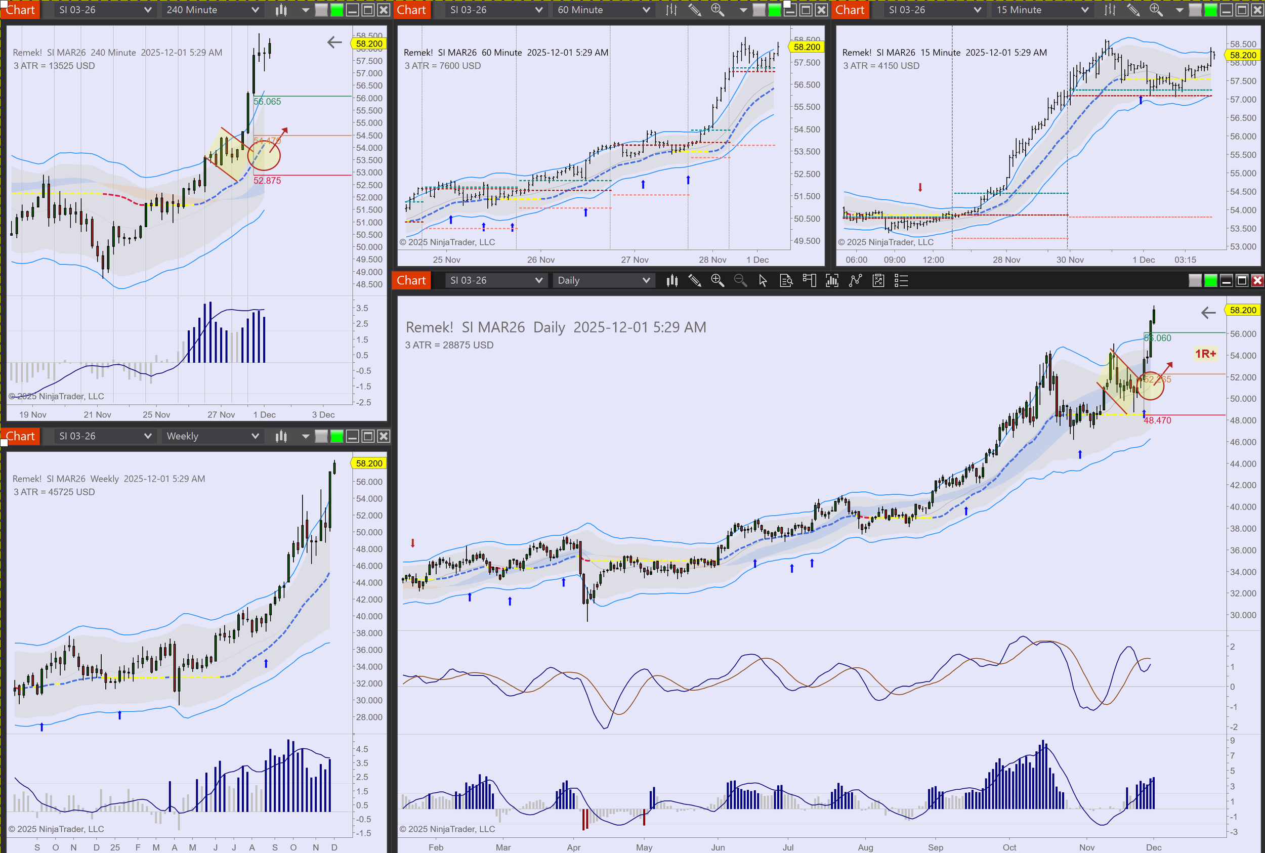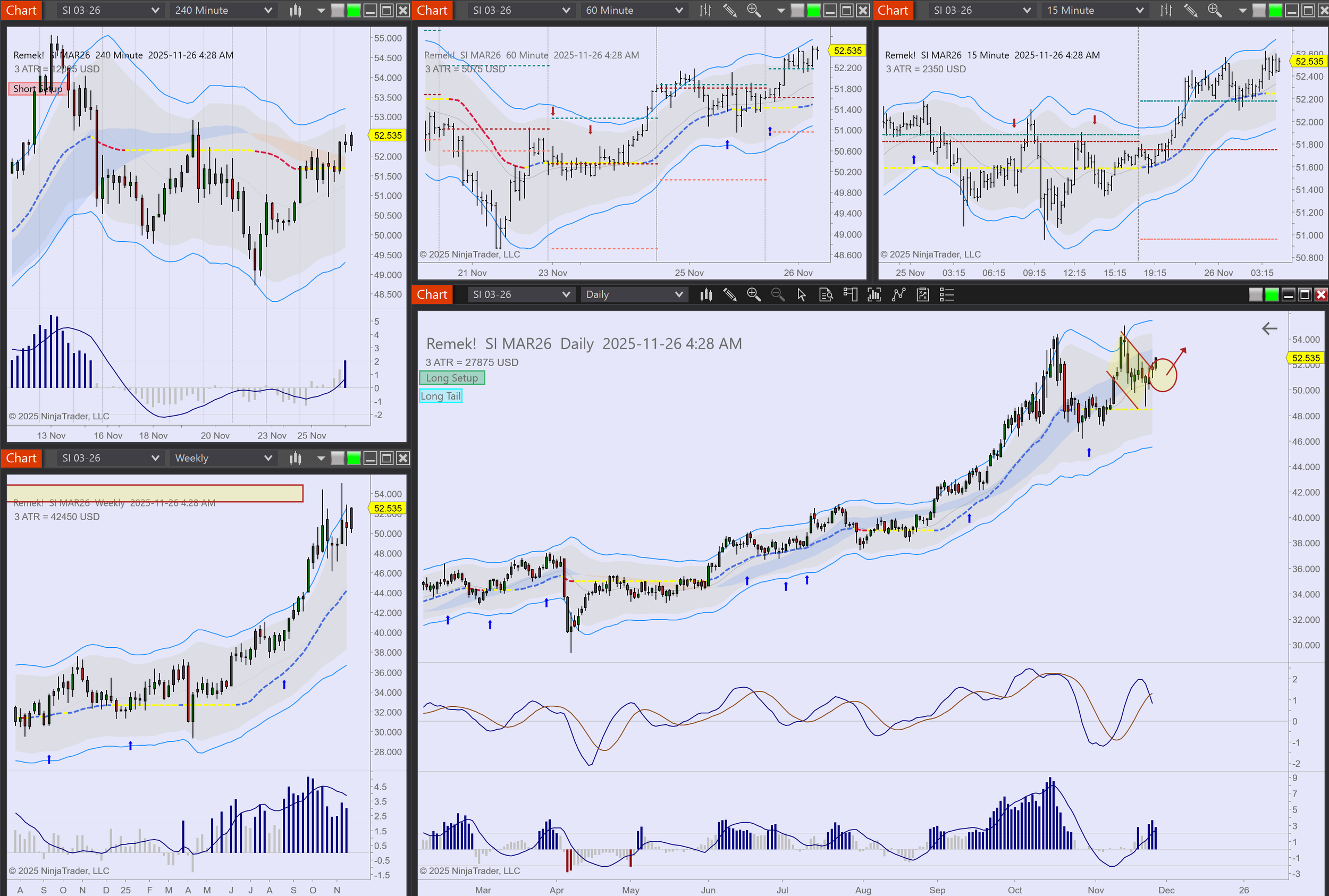 Commodities: NG, SI longs in progress. GC long setup. CL hits Keltner, out.