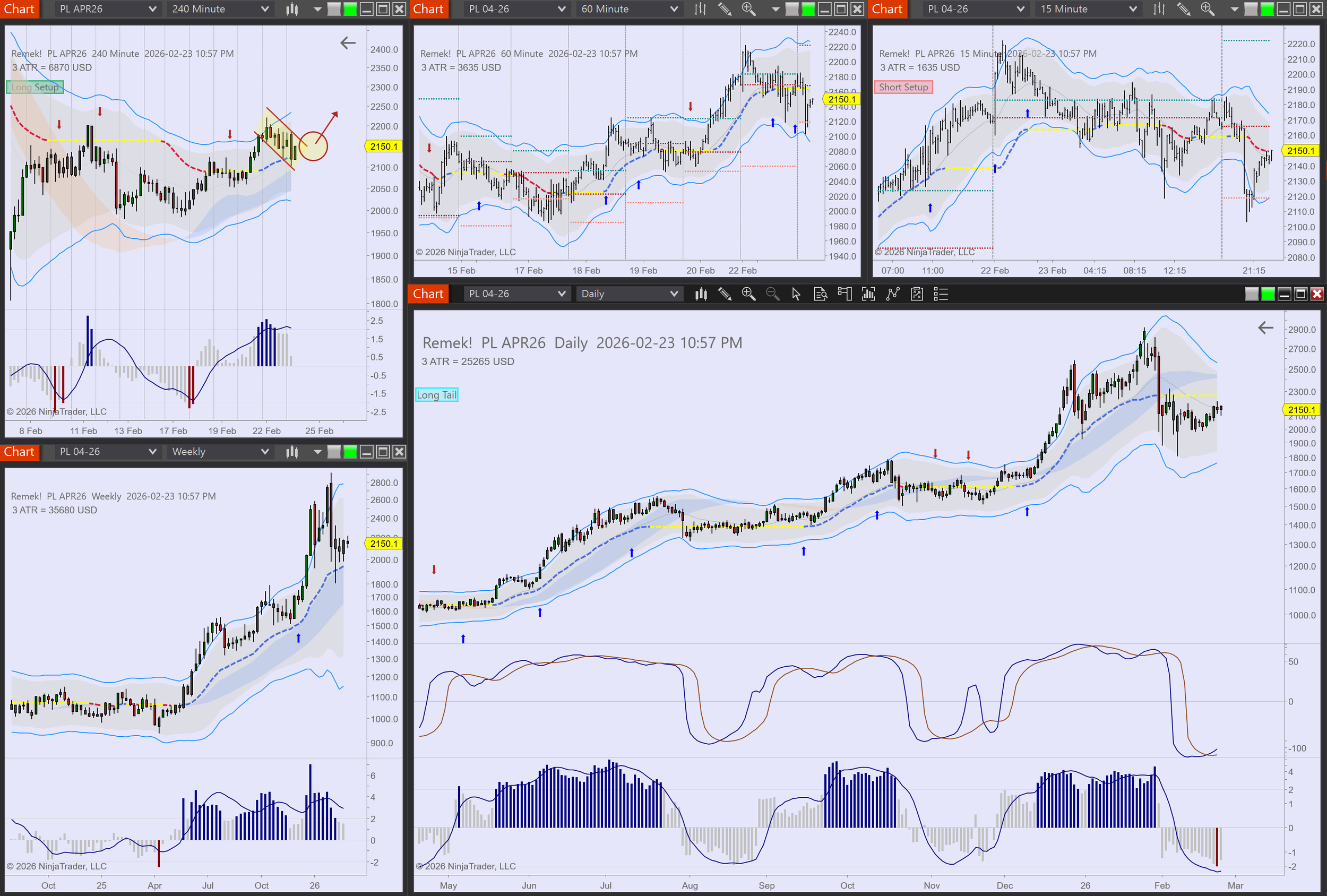 Commodities: CL long in progress. GC long in progress, long setups on PA, PL