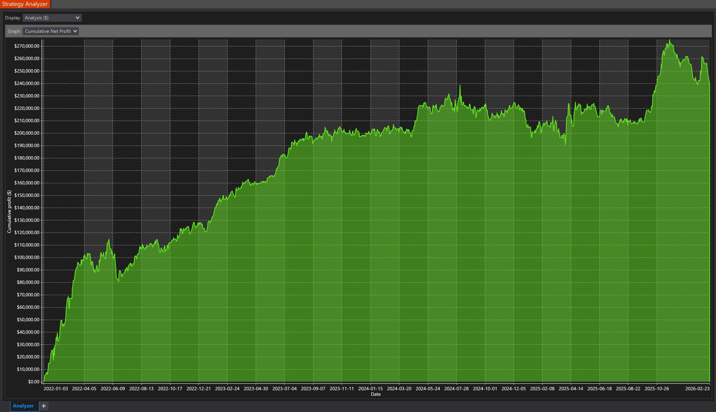 As a third example, see GC’s backtest for the same period. GC has produced exorbitant returns lately, and it and silver were our most profitable instruments in 2025, but what a wild ride it was with an Annualized Sharpe Ratio of a mere 0.520!