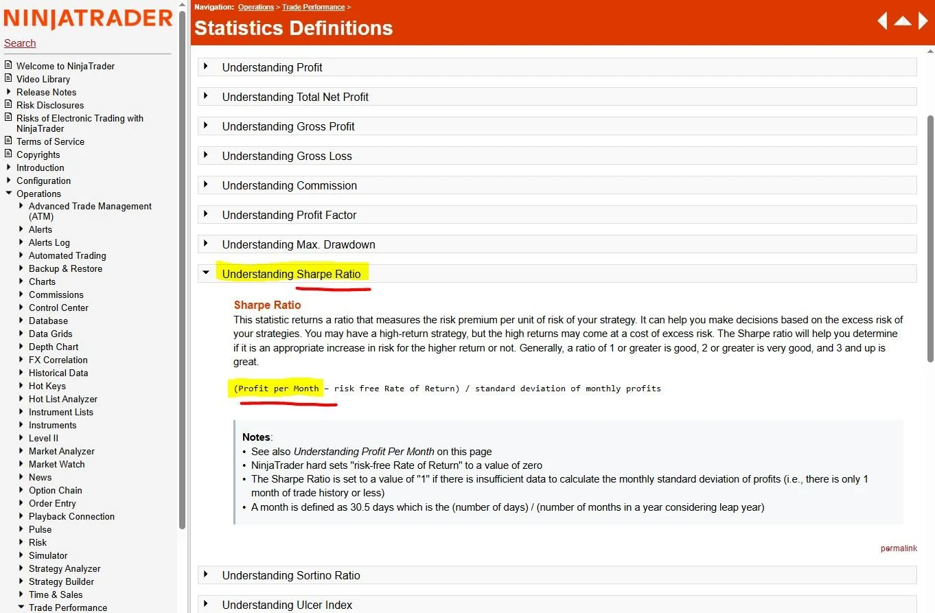 When we run our backtests in NT8’s Strategy Analyzer, NT8 returns the Sharpe Ratio. It should be noted that NT8 gives this metrics based on the monthly profit.