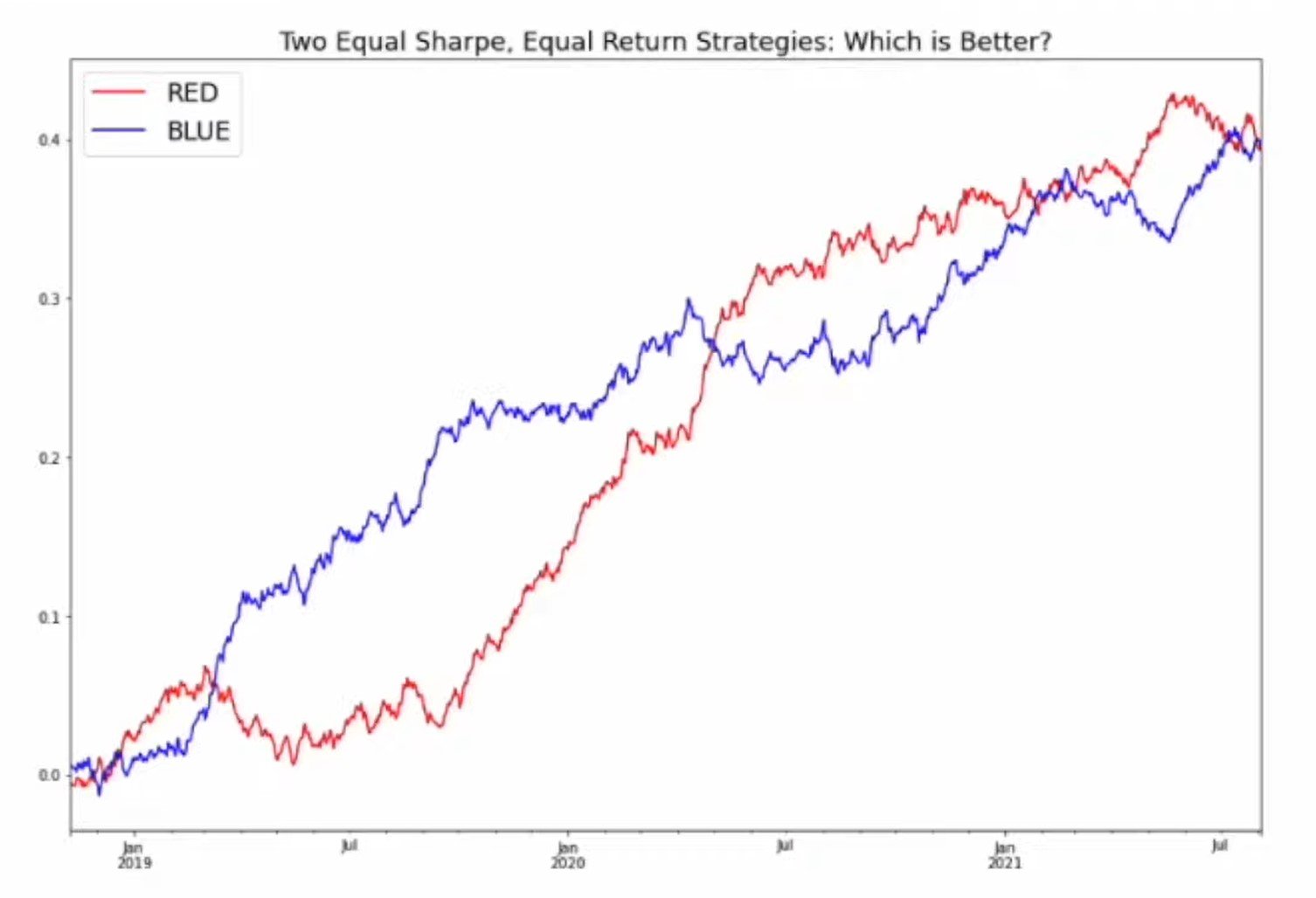 See the two equity curves (blue and red) on the right: same return over the same period. But which one is “better”?